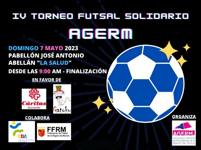 La Asociación General de Estudiantes de la Región de Murcia (AGERM) ha organizado un nuevo torneo de fútbol sala solidario, que ya va por su cuarta edición. En esta ocasión, los beneficios recogidos se repartirán a dos asociaciones: Cáritas de Alcantarilla y la Asociación protectora felina Gatoku. “Este año hemos querido ayudar más, por eso todo lo que se recoja irá destinado a ayudar tanto a personas como a animales” afirma Antonio García, responsable del evento deportivo y uno de los organizadores. Su compañero y también organizador, Andrés Ruiz, indica que “la verdad que estamos contentos porque la respuesta de todo el mundo ha sido positiva, como así se puede reflejar con los patrocinadores. Hemos recibido apoyo de más de quince empresas de Alcantarilla, que demuestran así su solidaridad al querer colaborar con nosotros y hacer posible que este evento se lleve a cabo. Vamos a disfrutar de una jornada muy solidaria, muy divertida y llena de fútbol”, asegura.