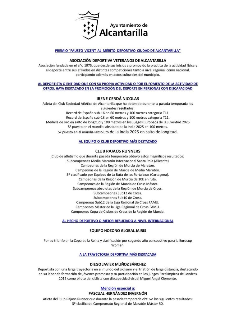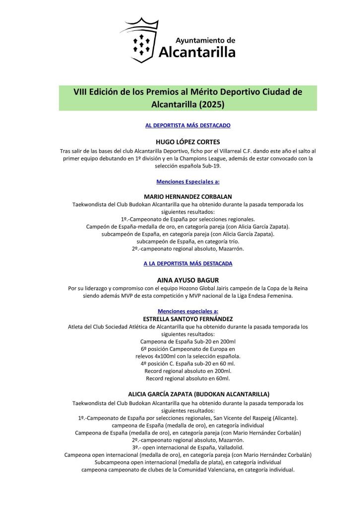 Inicio ALCANTARILLA VIII Edición de los Premios al Mérito Deportivo ‘Ciudad de Alcantarilla’ 2025 ALCANTARILLADEPORTES VIII Edición de los Premios al Mérito Deportivo ‘Ciudad de Alcantarilla’ 2025 Por Alcantarillaenlared - 18 de marzo de 2026 94 0 FacebookTwitterPinterestWhatsApp Esta es la lista de los #Premiados en esta edición correspondientes al año 2025